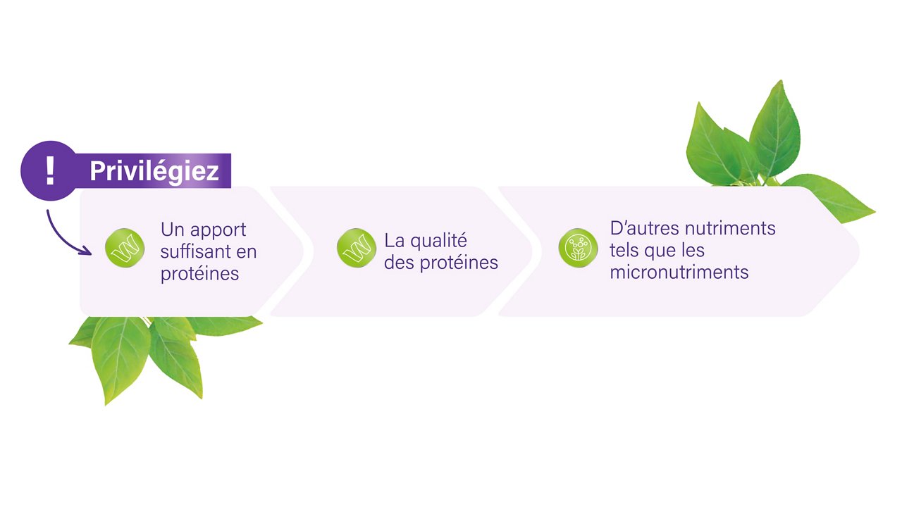 Les protéines de haute qualité contiennent tous les acides aminés essentiels dans les bonnes proportions et sont facilement digestibles. La plupart des protéines végétales sont moins digestes et contiennent moins d'acides aminés essentiels que les protéines animales. Par conséquent, les protéines provenant de sources végétales non transformées sont généralement moins facilement utilisées par l'organisme pour développer la masse musculaire que les protéines de sources animales. Il est important d'en tenir compte lors de la préparation des repas et de leur intégration au sein de votre alimentation quotidienne. Ceci est particulièrement important pour les personnes atteintes de maladies chroniques ou aiguës et/ou présentant un risque de dénutrition. Leurs besoins quotidiens en protéines sont supérieurs à ceux des adultes en bonne santé et ont souvent un appétit réduit. De plus, une attention particulière doit être portée aux autres nutriments, tels que les vitamines et les minéraux. Cela concerne notamment les nutriments présents en plus grande quantité ou uniquement dans les produits provenant de source animale, comme le fer, le zinc, les acides gras oméga-3, le calcium, la vitamine D, la vitamine B12 et l'iode.