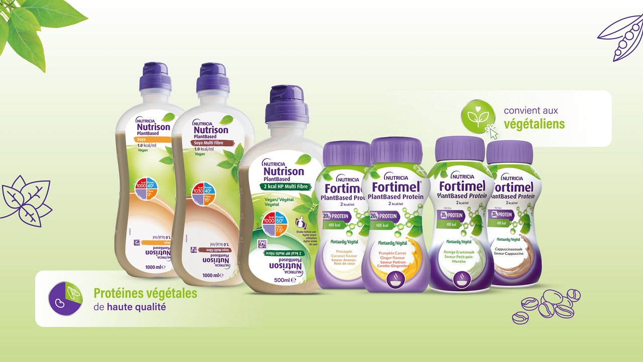 L'alimentation végétale est de plus en plus recommandée en raison de ses effets positifs sur la santé et l'environnement. Cela entraîne une augmentation de la demande pour des options alimentaires à base de plantes, y compris chez les patients souffrant de dénutrition liée à une maladie3,4. Chez ces patients, cela peut s'avérer particulièrement difficile, car ils ont moins d'appétit alors qu'ils ont des besoins énergétiques et protéiques accrus. Nutricia propose diverses options d’alimentation médicale à base de plantes aux patients qui privilégient une alimentation (plus) végétale lorsque la consommation régulière d'aliments est impossible ou insuffisante.