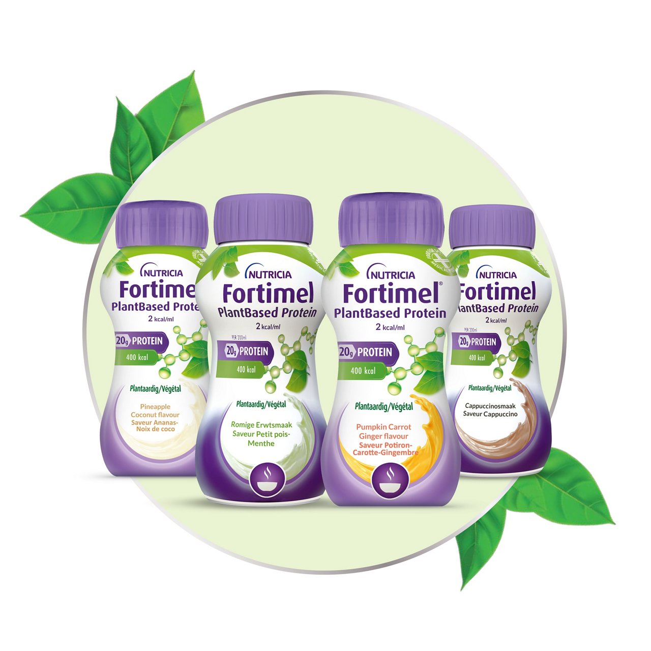 FORTIMEL PlantBased Protein 2 kcal est notre nouveau complément nutritionnel oral d'origine végétale riche en énergie et protéines. Une bouteille de 200 ml contient 400 kcal et 20 grammes de protéines. FORTIMEL PlantBased Protein 2 kcal est disponible en quatre saveurs uniques, dont deux saveurs salées qui peuvent également être consommées chaudes.