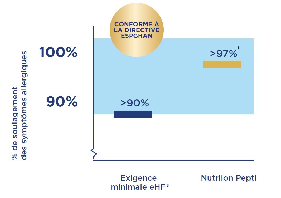 Dans un hydrolysat de protéines extensif (eHF), les protéines de lait de vache sont coupées en petits morceaux. Les EHF ont une efficacité supérieure à 90 %.1-3 Nutrilon Pepti est efficace dans 97 % des cas.1